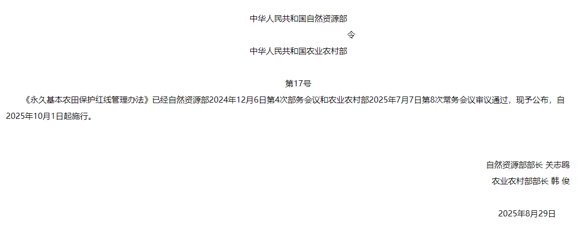永久基本农田保护红线管理办法(自然资源部、农业农村部令第17号 )