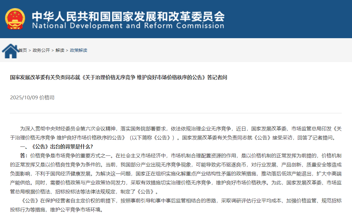 国家发展改革委有关负责同志就《关于治理价格无序竞争 维护良好市场价格秩序的公告》答记者问
