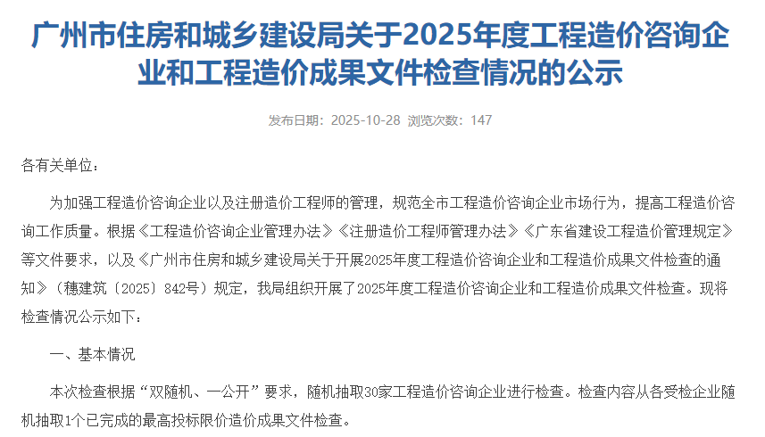 关于2025年度工程造价咨询企业和工程造价成果文件检查情况的公示(穗建筑〔2025〕1226号)