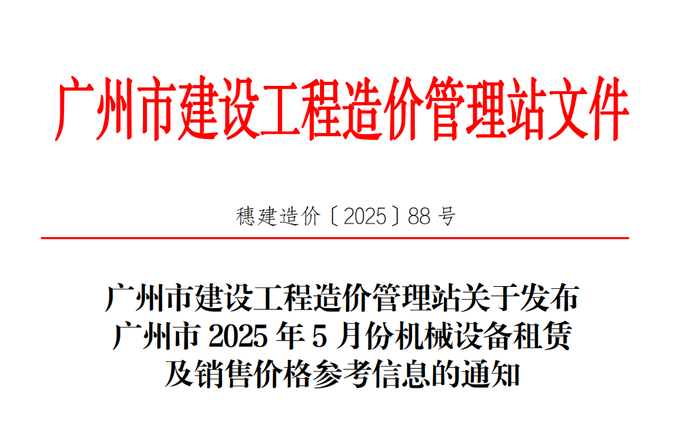 关于发布广州市2025年5月份机械设备租赁及销售价格参考信息的通知(穗建造价〔2025〕88 号)