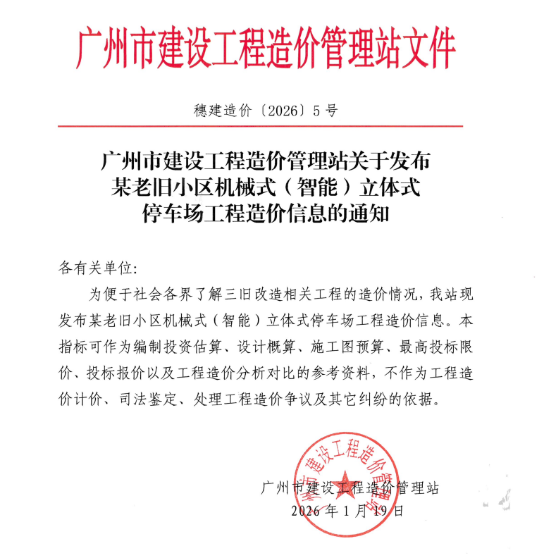 关于发布某老旧小区机械式(智能)立体式停车场工程造价信息的通知(穗建造价[2026]5号)